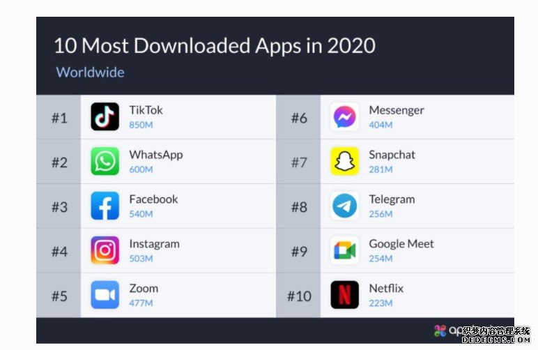 2020年,TikTok的下载量达到了惊人的8.5亿次。但在下载量排名前六的应用中,有四款Facebook应用的安装次数甚至达到了20.5亿次。